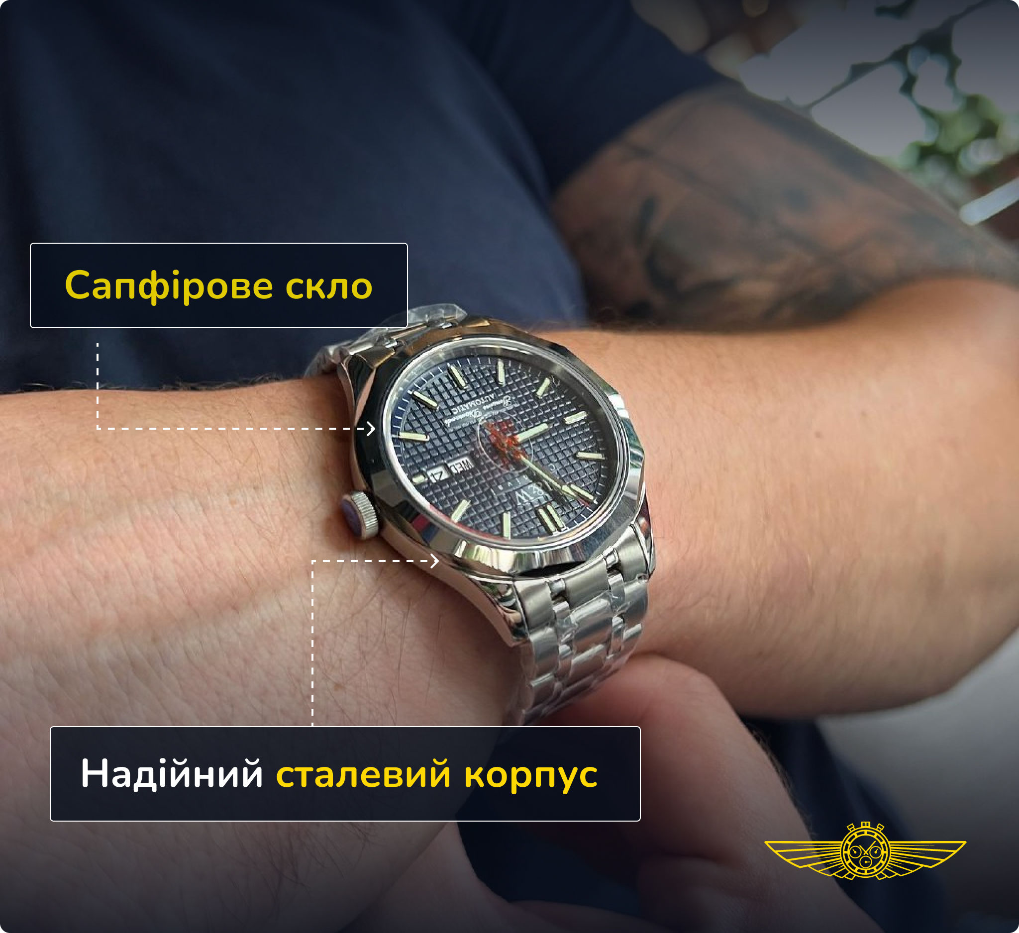 Сапфірове скло в поєднанні з циферблатом в стилі женевські цвяхи, неперевершено грає на сонячних променях, і додає максимальної брутальності.