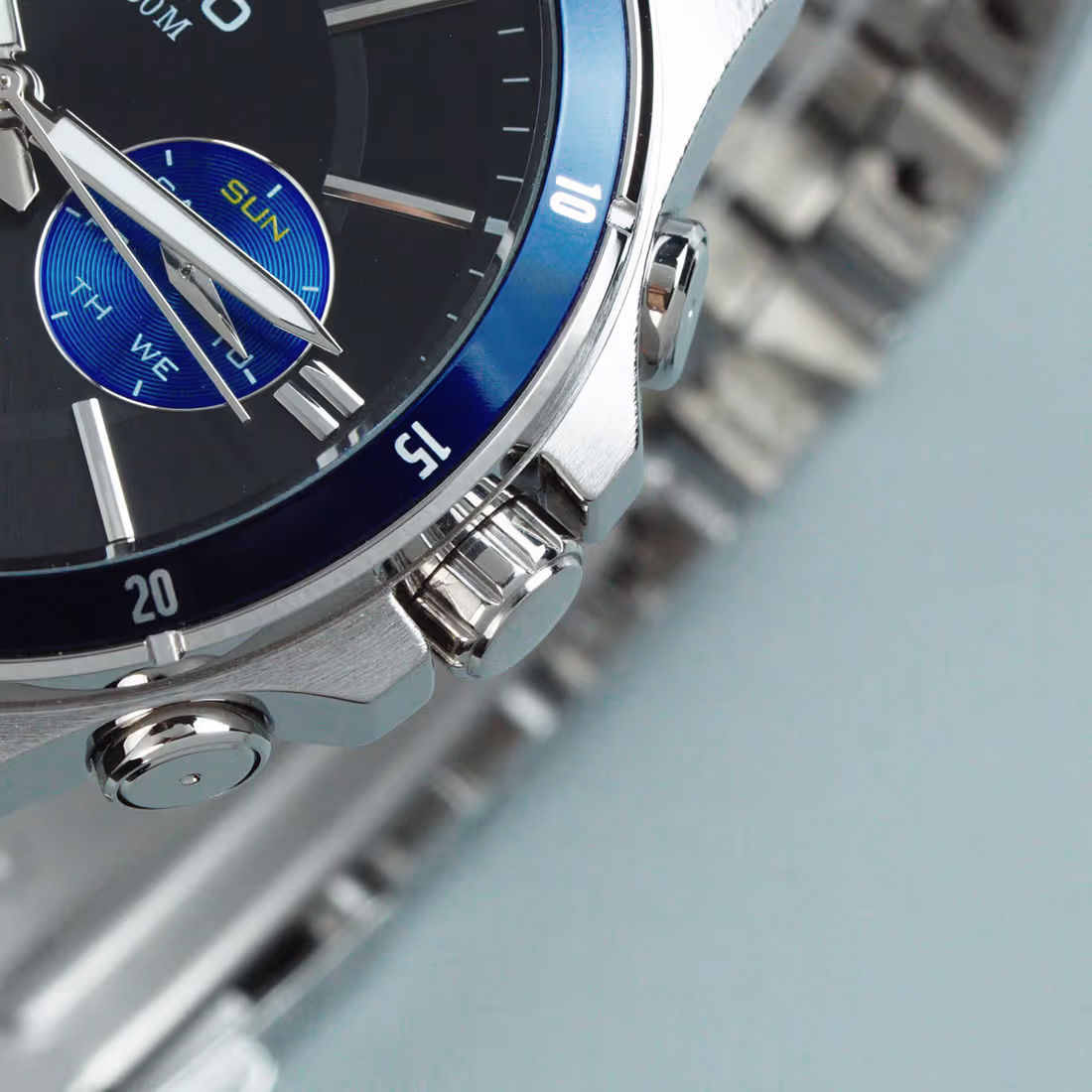 Годинник має міцний корпус та браслет із нержавіючої сталі, що забезпечує довговічність та стійкість до зносу. Глибокий синій циферблат із чіткими сріблястими мітками та стрілками додає вишуканості та забезпечує легке зчитування часу. Три додаткові циферблати відображають день тижня, дату та 24-годинний формат часу, додаючи функціональності та стилю.