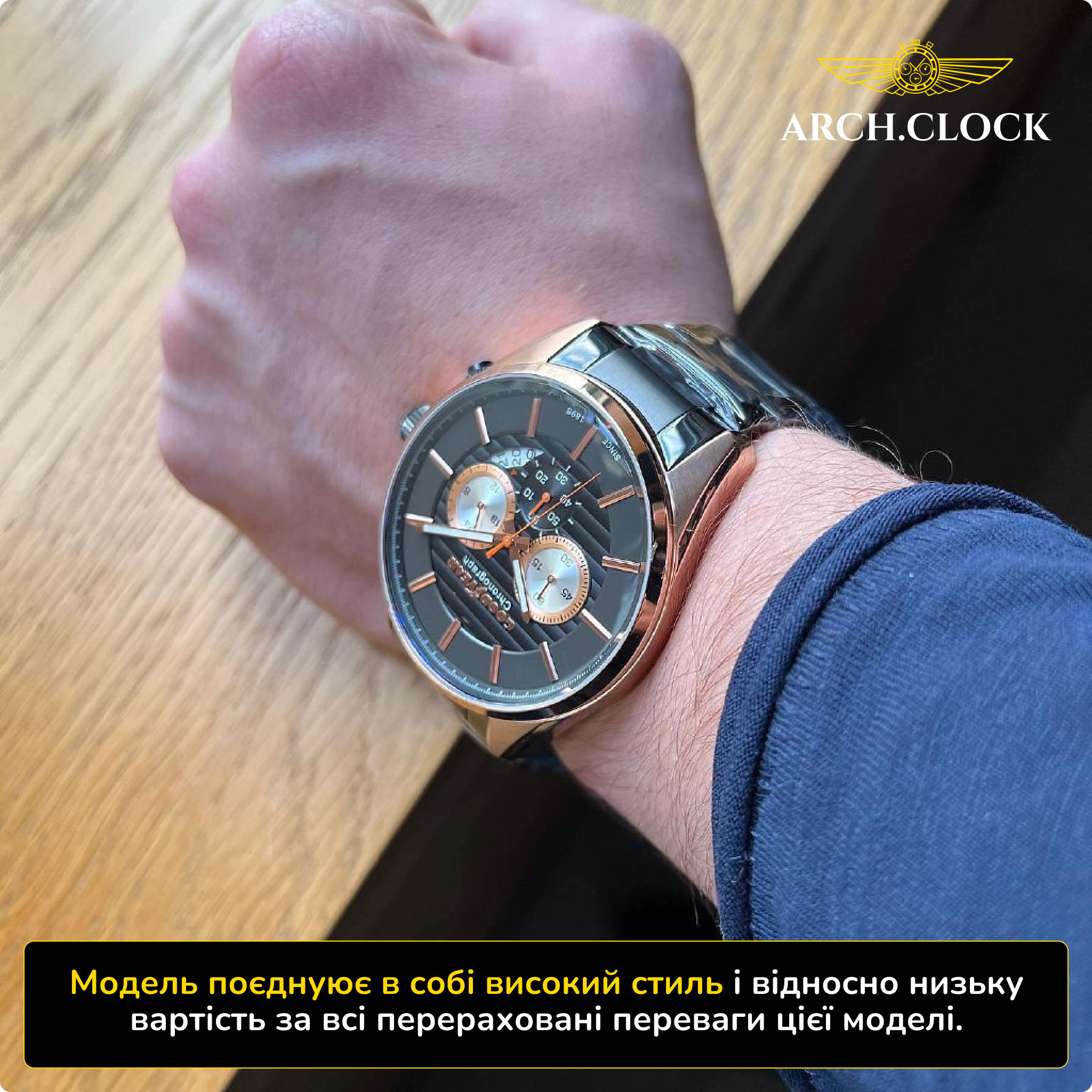 Корпус годинника виготовлений зі сталі вищої проби, що гарантує його міцність і надійність. Закрита задня кришка забезпечує додатковий захист механізму годинника від пилу та вологи, забезпечуючи тривалий та надійний роботу.