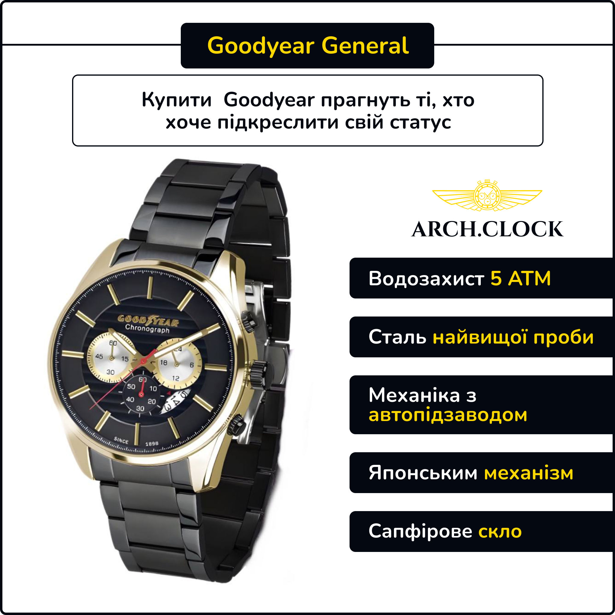 Годинник Goodyear General - це символ стилю та надійності, що втілює в собі найкращі традиції класичного дизайну та передові технології. Цей годинник вражає своєю елегантністю, високою якістю та функціональністю, що робить його ідеальним вибором для сучасних людей, які цінують стиль і практичність.