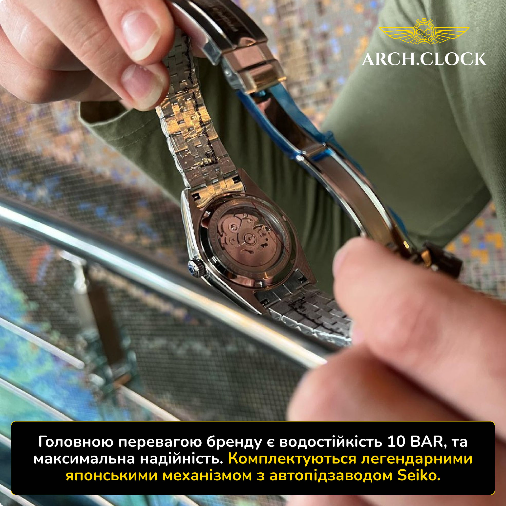 • Автоматичний механізм Seiko NH35 з автопідзаводом на 21 камені – гарантія точності й надійності.