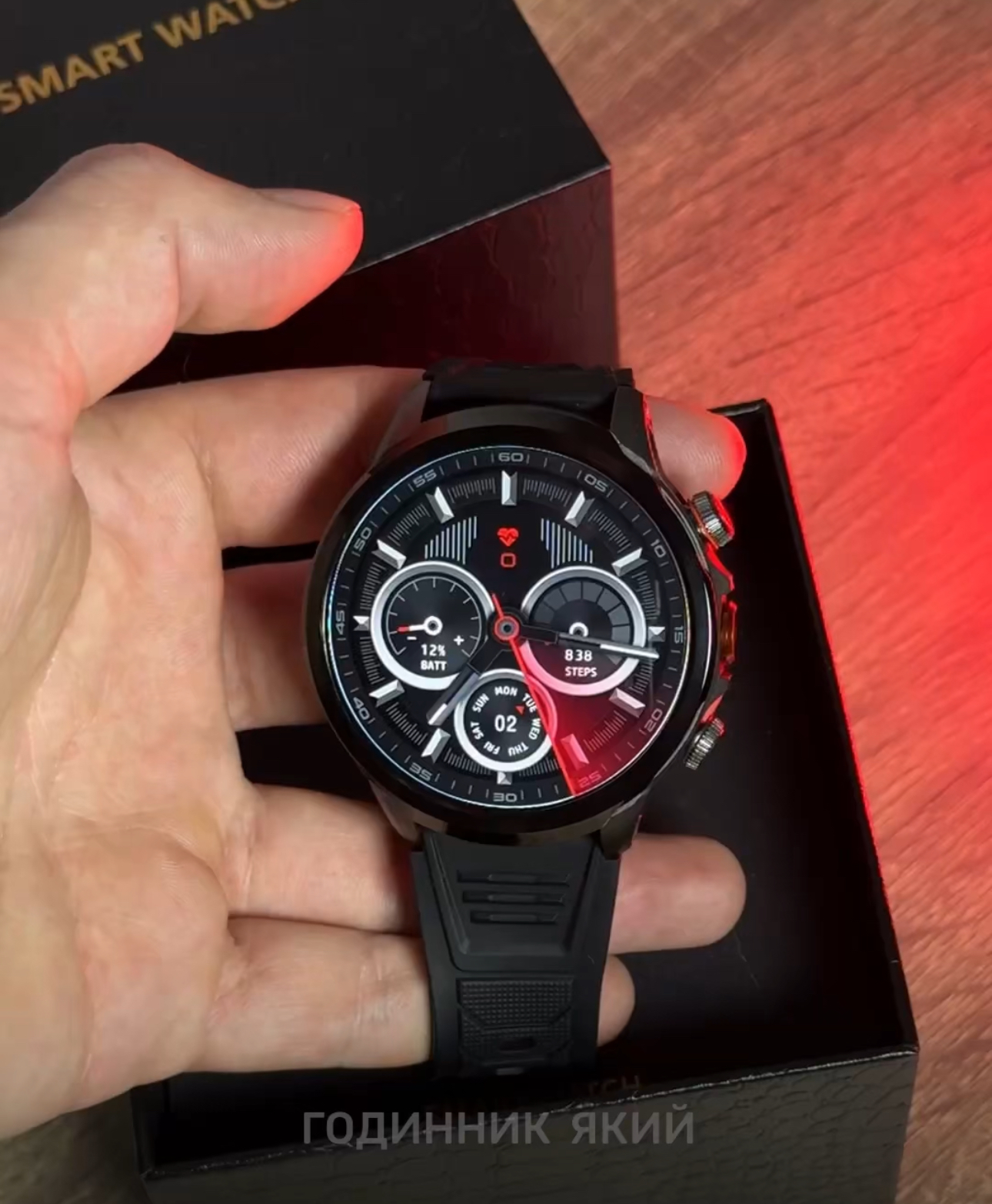 Годинник комфортно сидить на руці, не відчувається як пластиковий “спорт-трекер”, а виглядає як технологічний аксесуар для чоловіка, який знає ціну якості.