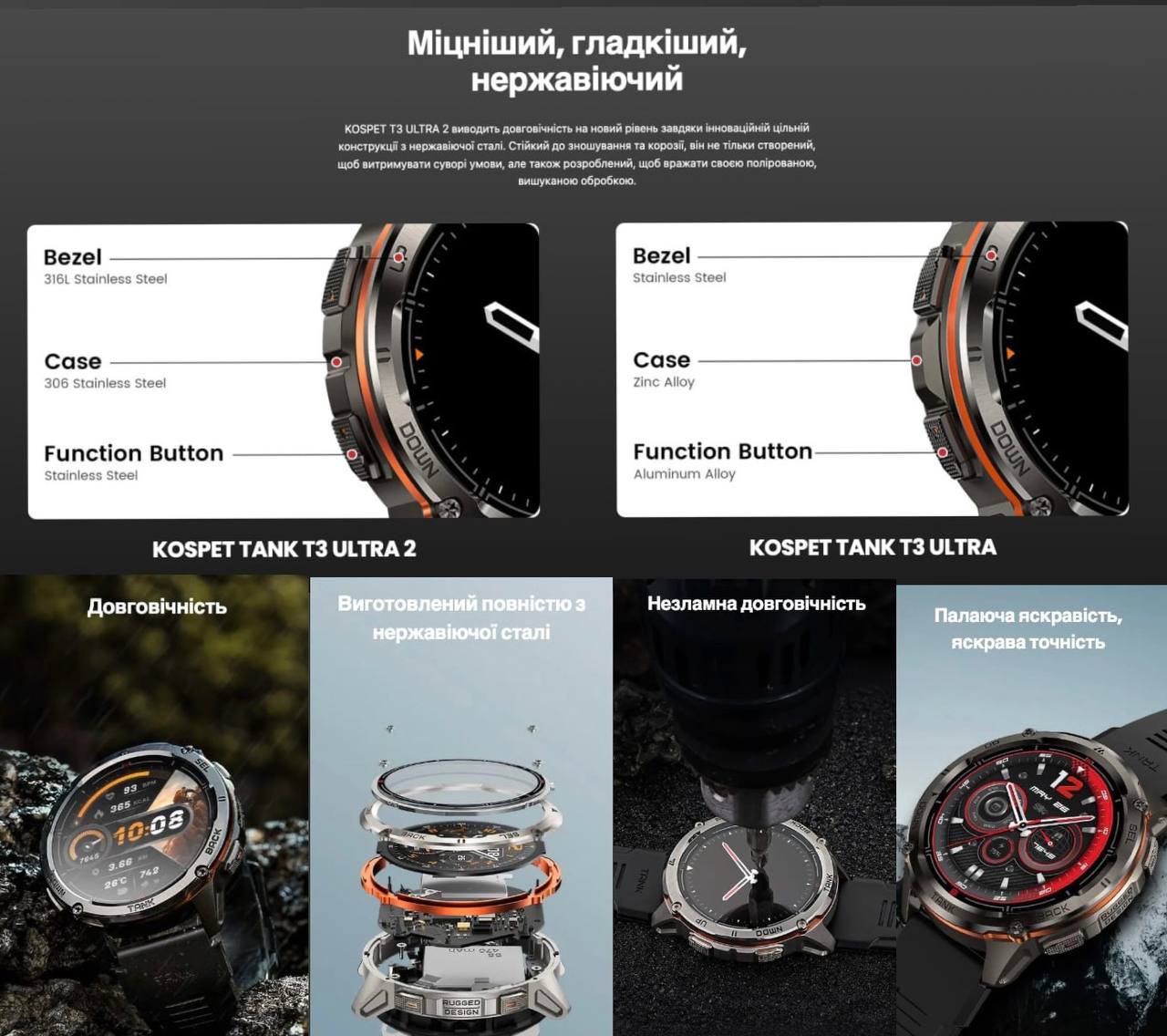 • TANK T3 ULTRA 2: Має повністю нержавіючий корпус та екран із захисним склом Corning® Gorilla® Glass, що підвищує його міцність та стійкість до подряпин.