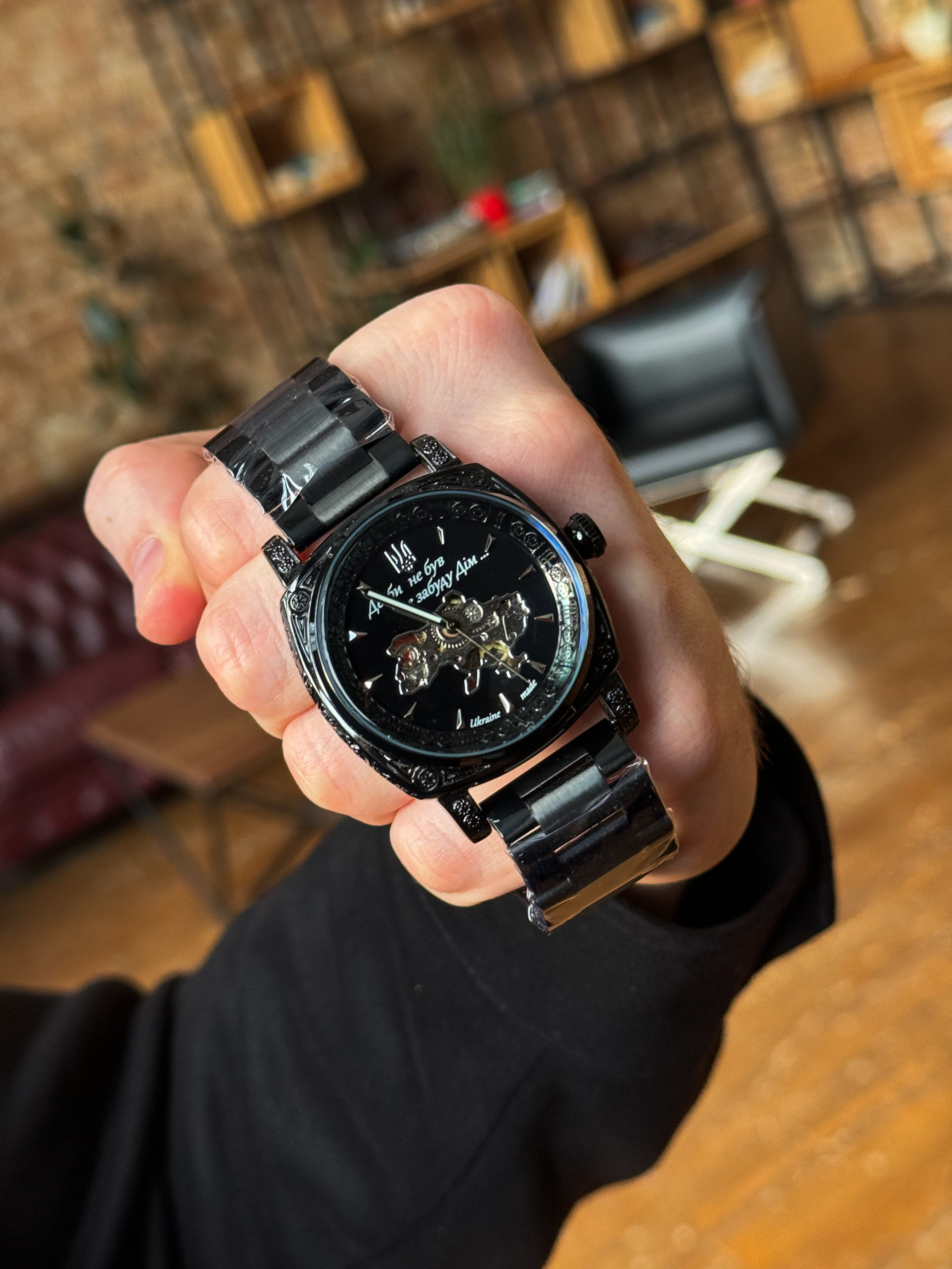 Patriot Otaman ULTRA BlackS – це не просто годинник, а уособлення мужності, стилю та патріотизму. Вишукане поєднання глибокого чорного корпусу зі сталевим браслетом і срібного циферблата створює розкішний контраст, що неймовірно грає на світлі. Його автоматичний японський механізм забезпечує точність та довговічність, а скелетон-циферблат у вигляді мапи України підкреслює дух свободи.